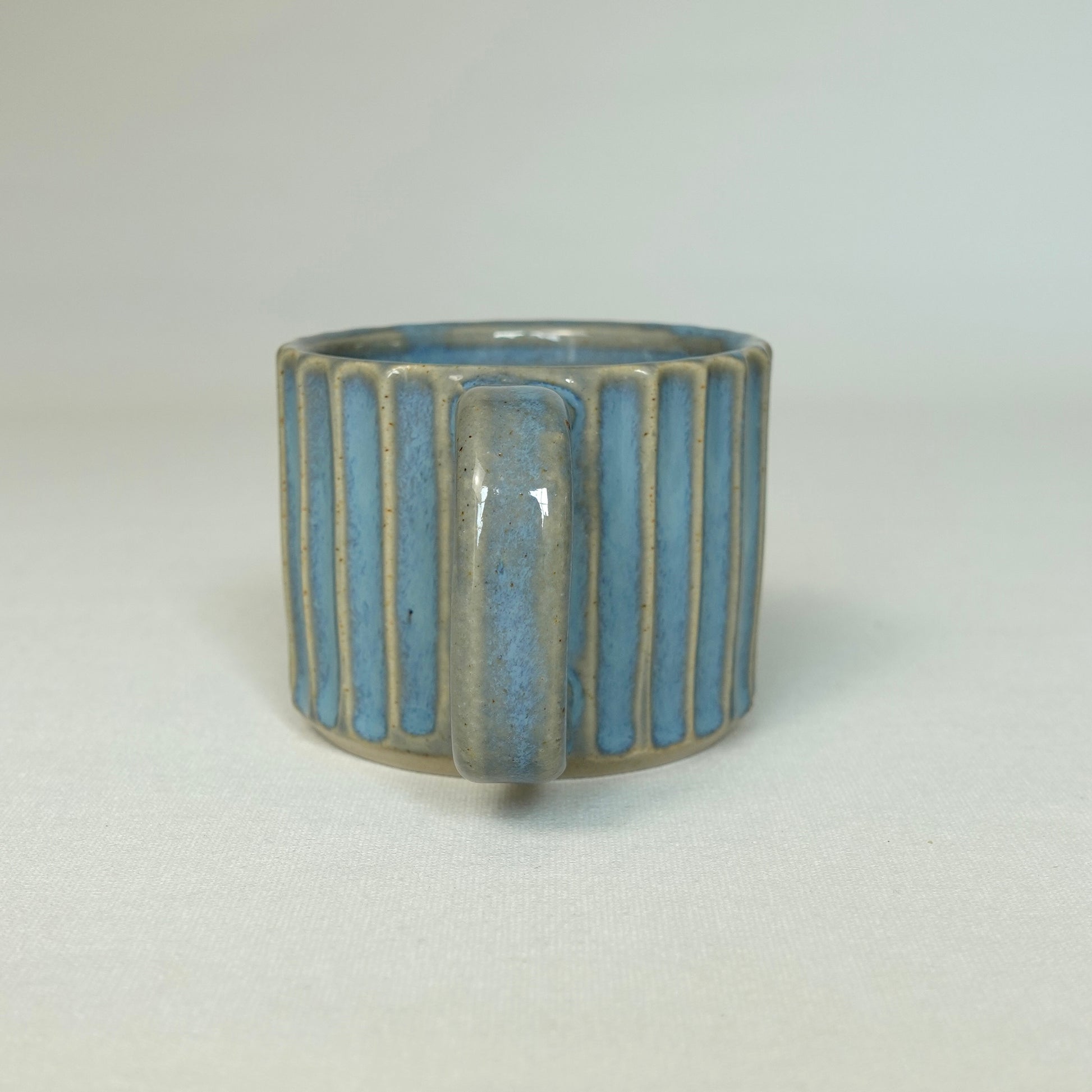 Ces tasses sont réalisées au tour avec du grès. Une fois que la terre est moins malléable, elles sont gravées, ce qui leur donne cet aspect de petites vagues. Elles sont ensuite émaillées par immersion.