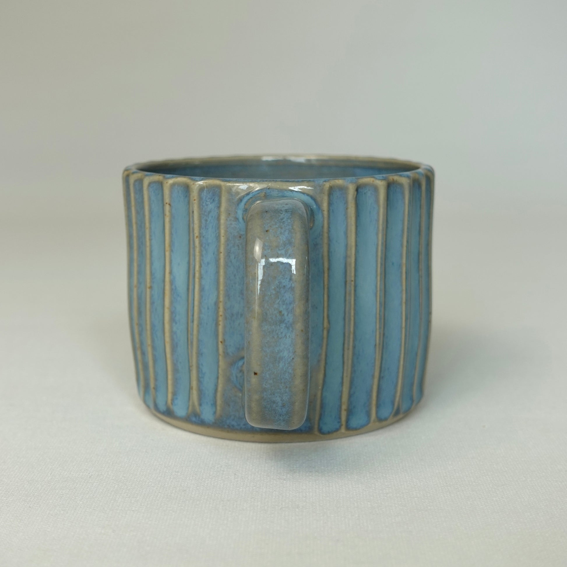 Ces tasses sont réalisées au tour avec du grès. Une fois que la terre est moins malléable, elles sont gravées, ce qui leur donne cet aspect de petites vagues. Elles sont ensuite émaillées par immersion.