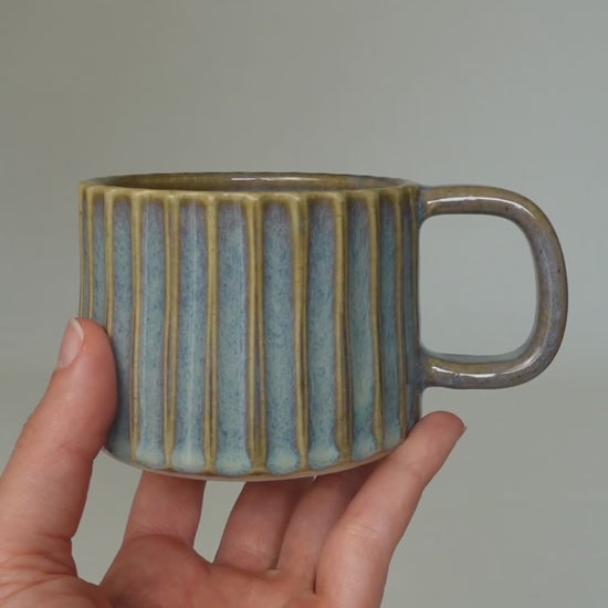 Ces tasses sont réalisées au tour avec du grès. Une fois que la terre est moins malléable, elles sont gravées, ce qui leur donne cet aspect de petites vagues. Elles sont ensuite émaillées par immersion.