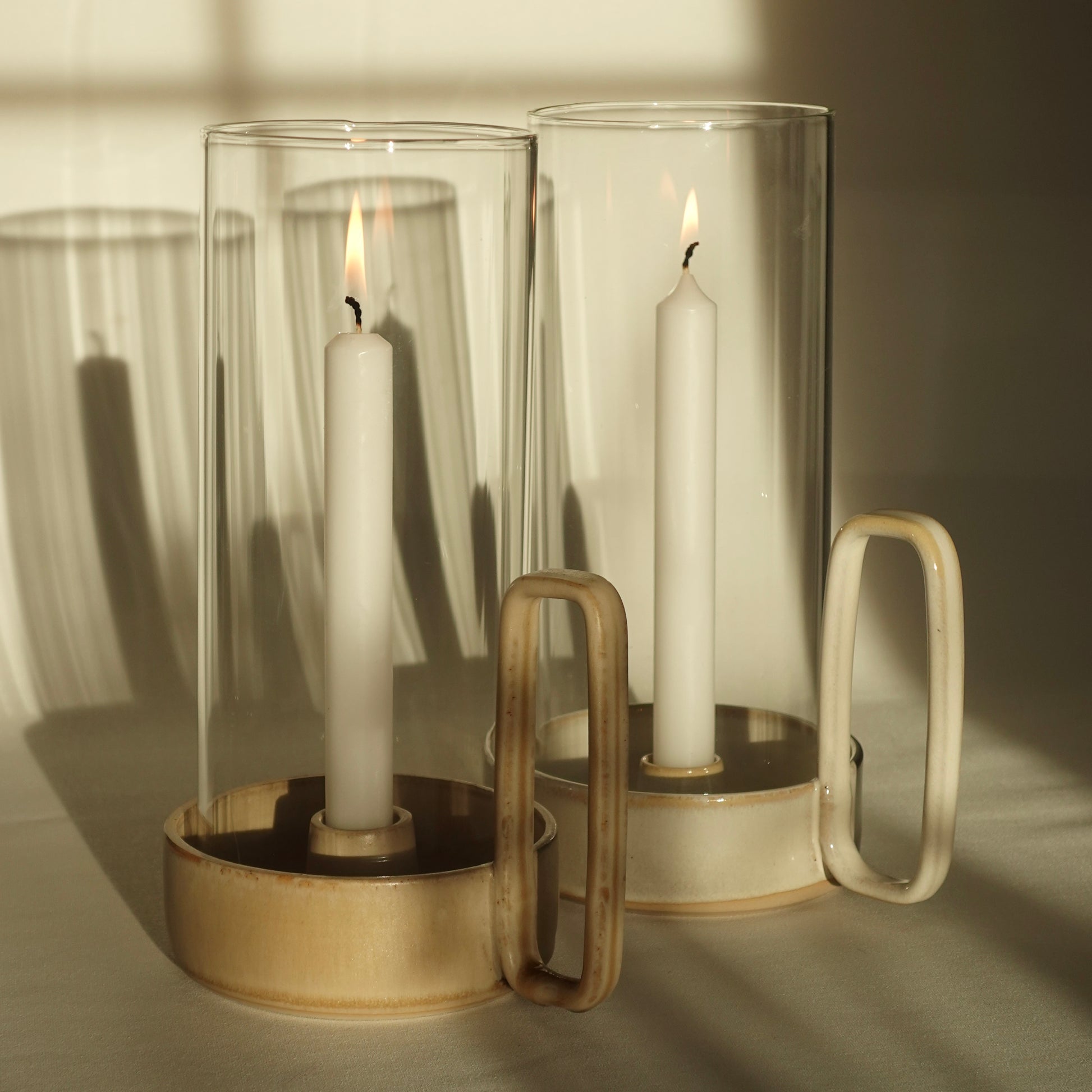 Bougeoir en céramique émaillée réalisé avec un émail fait maison. Le cylindre est en verre borosilicate et a été soufflé par l'artisan Claude Merkli à Echandens. Il offre une très haute résistance à la chaleur et aux chocs thermiques.